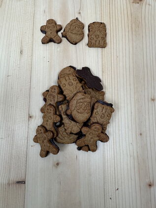 Weizenmehl, 15% Zartbitterschokolade (Kakaomasse, Zucker, Kakaobutter, Emulgator: Lecithine (Soja), Zucker, Palmfett, brauner Zucker,4% Butterreinfett, Marzipan (Mandeln, Zucker, Invertzuckersirup, Glukose-Fruktose-Sirup, Gewürze, Salz Karamellzuckersirup, Backtriebmittel (Ammoniumhydrogencarbonat, Natriumhydroggencarbonat, Kaliumcarbonat),Zitronenschale, Emulgator (Lecithine (Soja), natürliches Aroma, Zimt